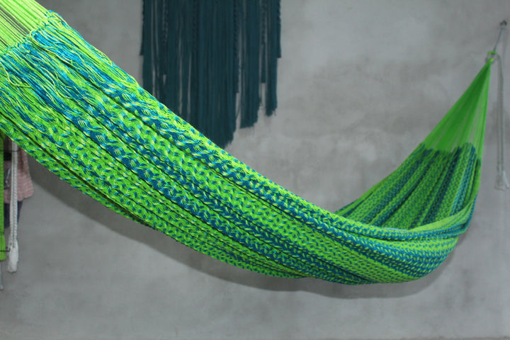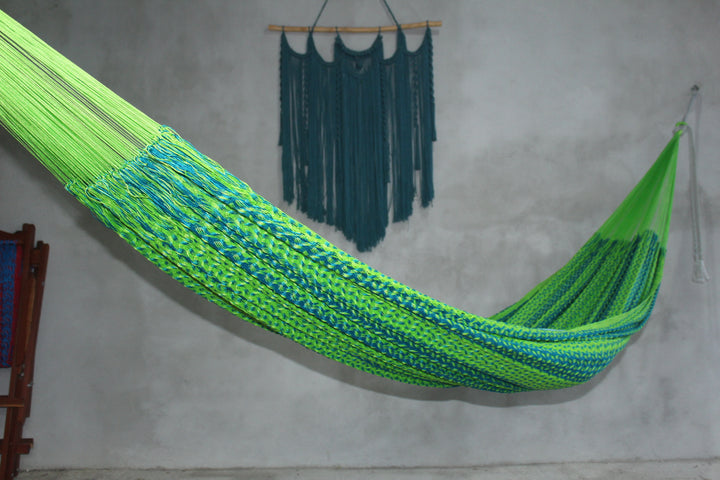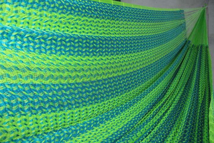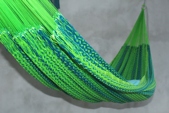 Hamaca King Size Yucateca de hilo delgado calibre 9 nylon urdida a mano de punta cerrada.